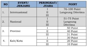 - Sertifikat/piagam yang dijadikan bukti prestasi berasal dari kejuaraan yang dilaksanakan secara berjenjang dan berkelanjutan, dengan penjelasan sebagai berikut: