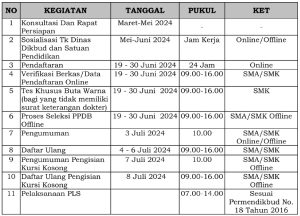 - Jadwal PPDB; Untuk kelancaran penyelenggaraan PPDB SMA dan SMK Tahun Pelajaran 2024/2025 di Provinsi Sulawesi Tenggara diatur dengan jadwal sebagai berikut: